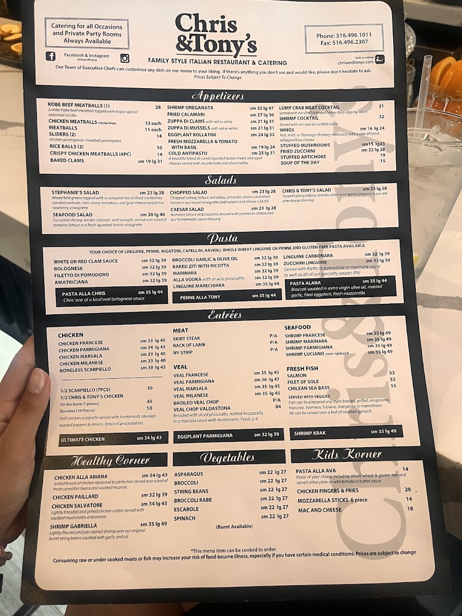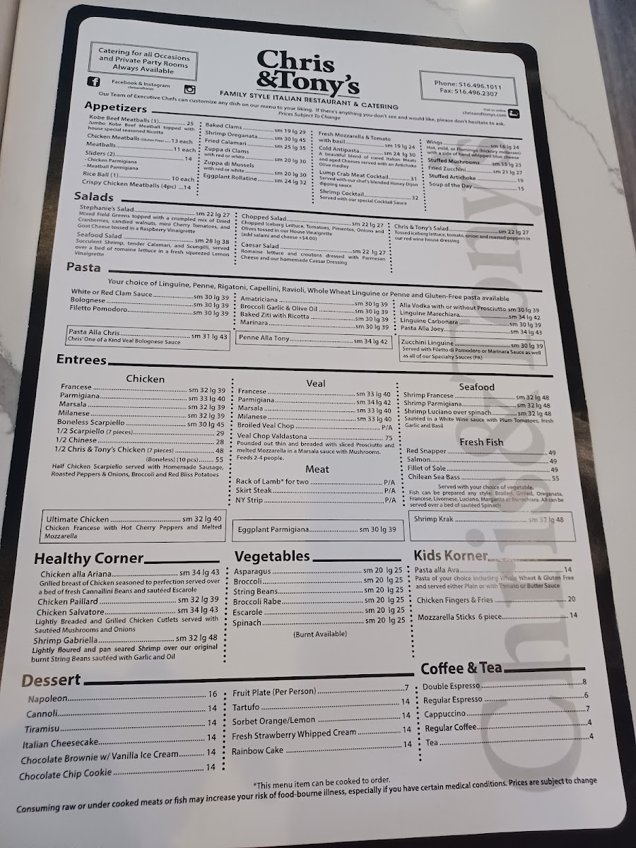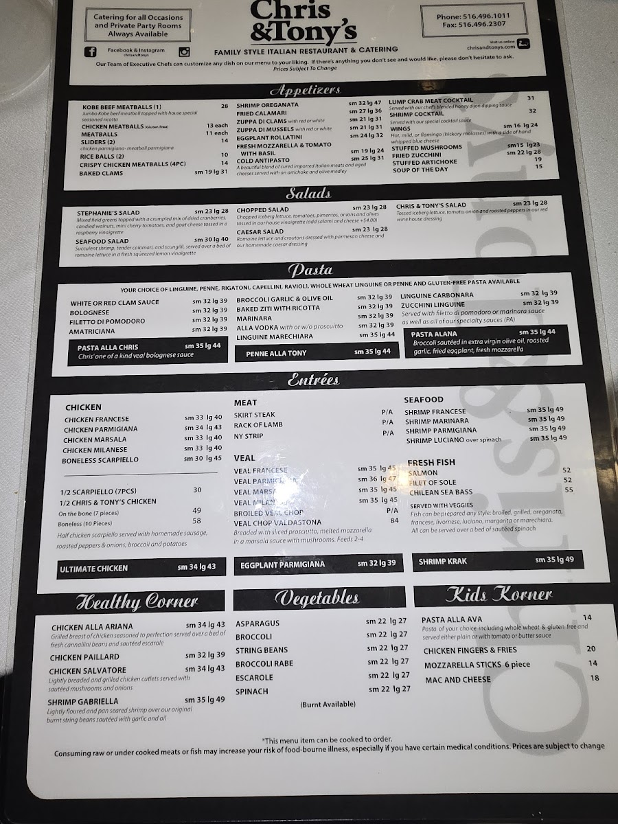 Welcome to Chris & Tony’s, an exquisite Italian restaurant located at 352 Jericho Tpke, Syosset, NY. This establishment excels in delivering a delightful dining experience, characterized by its chic, family-friendly atmosphere and exceptional service. The menu boasts a thoughtful selection of authentic Italian dishes, including tantalizing pastas like their renowned White or Red Clam Sauce and deliciously rich Bolognese. Don't miss the standout veal offerings, particularly the Veal Chop Valdostana, expertly prepared to perfection. Customers rave about the cozy ambiance, where staff members treat everyone like family, enhancing the overall dining experience. Frequent patrons recommend indulging in the homemade Italian ricotta cheesecake, a dessert that transcends expectations. With rave reviews highlighting both food and atmosphere, it's no surprise that Chris & Tony’s has become a beloved spot for both special occasions and casual gatherings. Immerse yourself in this culinary gem and savor the passion in every bite.