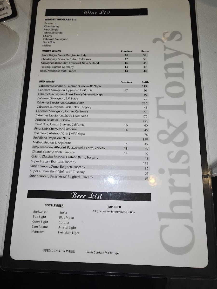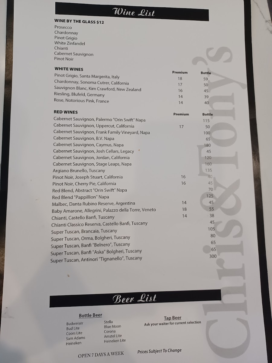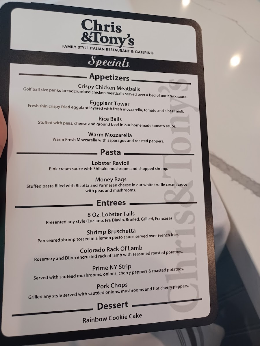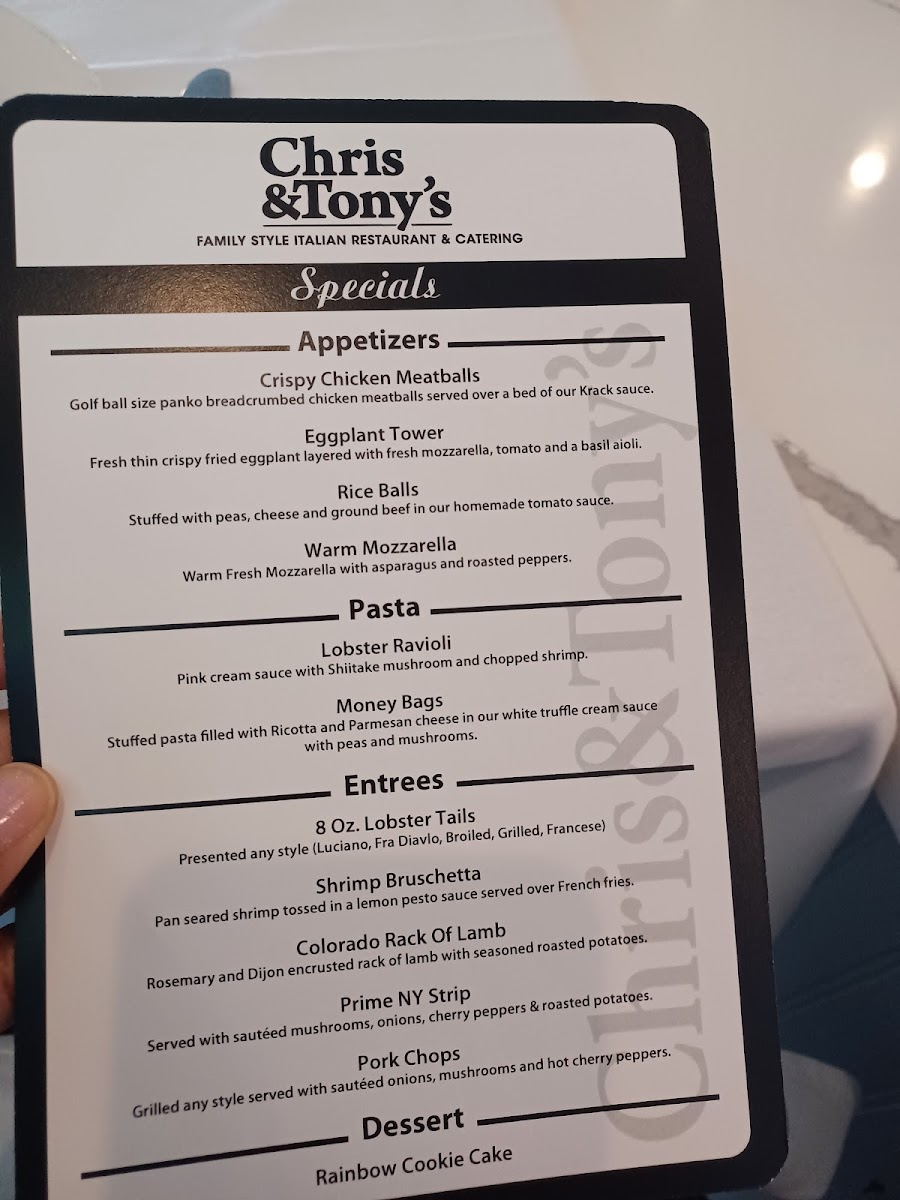Welcome to Chris & Tony’s, an exquisite Italian restaurant located at 352 Jericho Tpke, Syosset, NY. This establishment excels in delivering a delightful dining experience, characterized by its chic, family-friendly atmosphere and exceptional service. The menu boasts a thoughtful selection of authentic Italian dishes, including tantalizing pastas like their renowned White or Red Clam Sauce and deliciously rich Bolognese. Don't miss the standout veal offerings, particularly the Veal Chop Valdostana, expertly prepared to perfection. Customers rave about the cozy ambiance, where staff members treat everyone like family, enhancing the overall dining experience. Frequent patrons recommend indulging in the homemade Italian ricotta cheesecake, a dessert that transcends expectations. With rave reviews highlighting both food and atmosphere, it's no surprise that Chris & Tony’s has become a beloved spot for both special occasions and casual gatherings. Immerse yourself in this culinary gem and savor the passion in every bite.